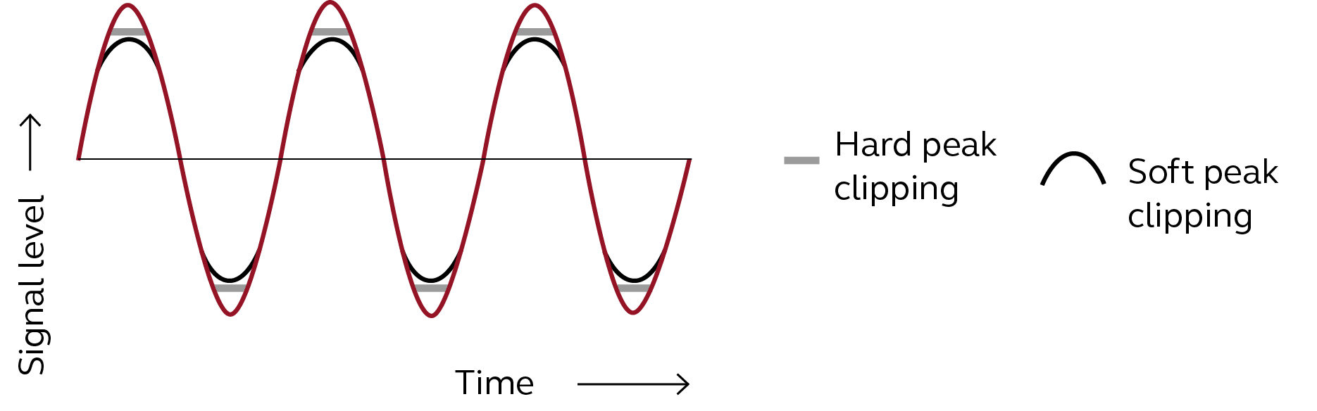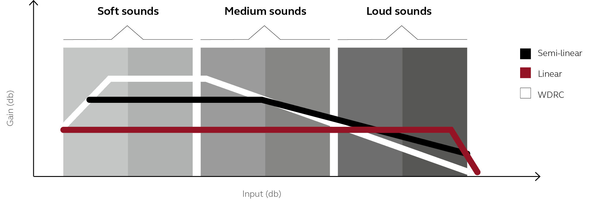 1:1 の圧縮比で、ソフト入力とラウド入力の利得を中程度のレベルと同じターゲットに設定します。 このモードでは、補聴器の出力を制限するためのオプションとして、ソフトピーククリッピングとハードピーククリッピングが提供されます。 このオプションは補聴器の出力に大きく歪みを生み出しますが(ハードクリッピングの方が大きい)、高度・重度難聴者には好まれることがあります。