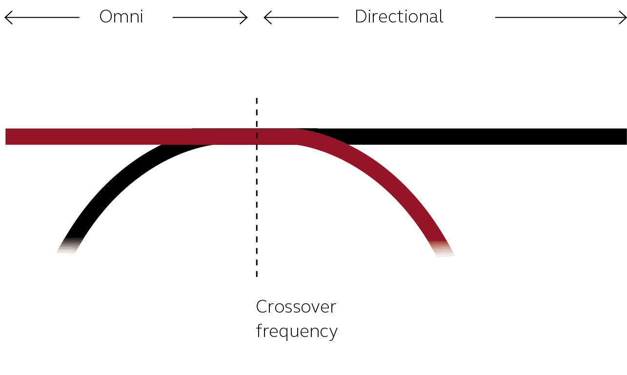 低信号の場合、周波数がクロスオーバー周波数を下回ると、無指向性として増幅されます。 クロスオーバー周波数は、補聴器の2つのマイク間のスペースによって異なります。