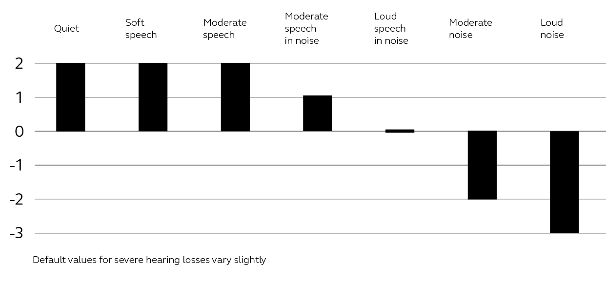 補聴器の利用者には、リスニング環境に応じて補聴器の音量に異なる好みがあることは周知の事実です。 したがって、環境適応システムが環境を判断する際、環境適応システムは音量を自動調整します。これにより利用者は、音量調整やプログラム変更を手動で調整する必要はありません。