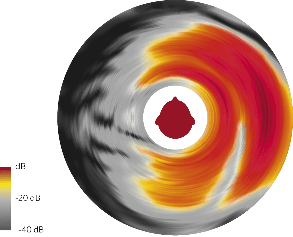 この図は、補聴器を使用していない右耳の角度に依存する減衰を示しています。 濃い赤色は、低減衰または減衰なしを示します。 補聴器を使用していない耳の特徴的な減衰パターンは、空間認識によって再現されます。